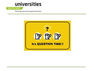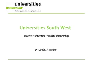 The document summarizes key information about universities in South West England. It notes that there are 13 universities in the region employing over 22,000 staff and teaching over 165,000 students. The universities have an annual economic impact of £3.5 billion and invest £210 million in research annually. The universities play an important social role through educating citizens, developing future leaders, and engaging with their local communities.