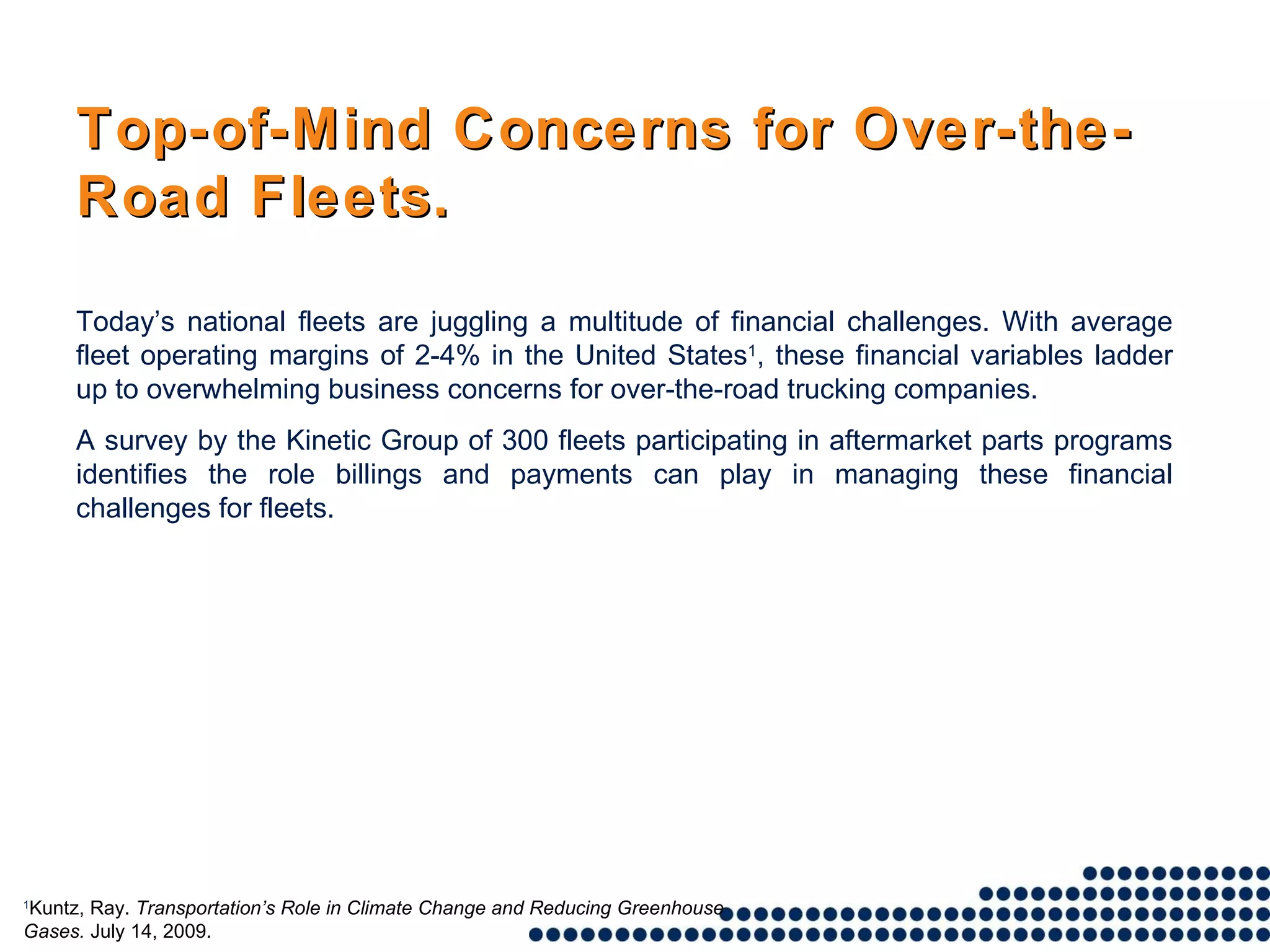 The trucking industry faces financial challenges with low operating margins, prompting fleets to seek efficient payment programs to manage costs. A survey shows 66% of fleets believe payment programs can reduce expenses, with 78.5% prioritizing purchasing controls to prevent fraud and misuse. Consolidated billing aids in simplifying the payment process, making participation in such programs appealing for enhancing convenience and overall business value.