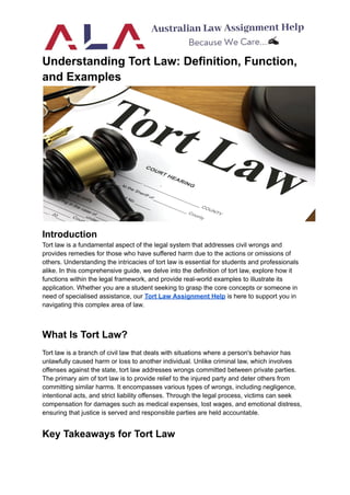 The document provides a comprehensive overview of tort law, which addresses civil wrongs resulting in harm due to the actions or omissions of others, focusing on its definition, purpose, and types, such as negligence and intentional torts. It outlines the legal remedies available to victims, including compensatory and punitive damages, and discusses the role of tort law in promoting justice and accountability in society. Additionally, the document covers tort reform, its objectives, and its impact on the legal system and economy.