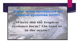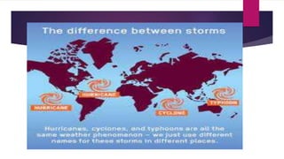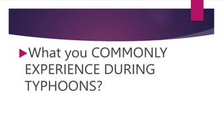 According to the document, typhoons are tropical cyclones that occur in the northwest Pacific Ocean. They form over warm tropical waters and have winds that spiral inward toward a central area. Typhoons are classified based on their maximum wind speeds, from tropical depression up to super typhoon. While typhoons, hurricanes, and cyclones refer to the same weather phenomenon, they are regionally named - typhoons occur in the northwest Pacific, cyclones in the Indian Ocean and South Pacific, and hurricanes in the northeast Pacific and Atlantic. Typhoons develop along the Intertropical Convergence Zone near the equator and over warm ocean waters above 26.5 degrees Celsius within the Philippine Area of Responsibility.