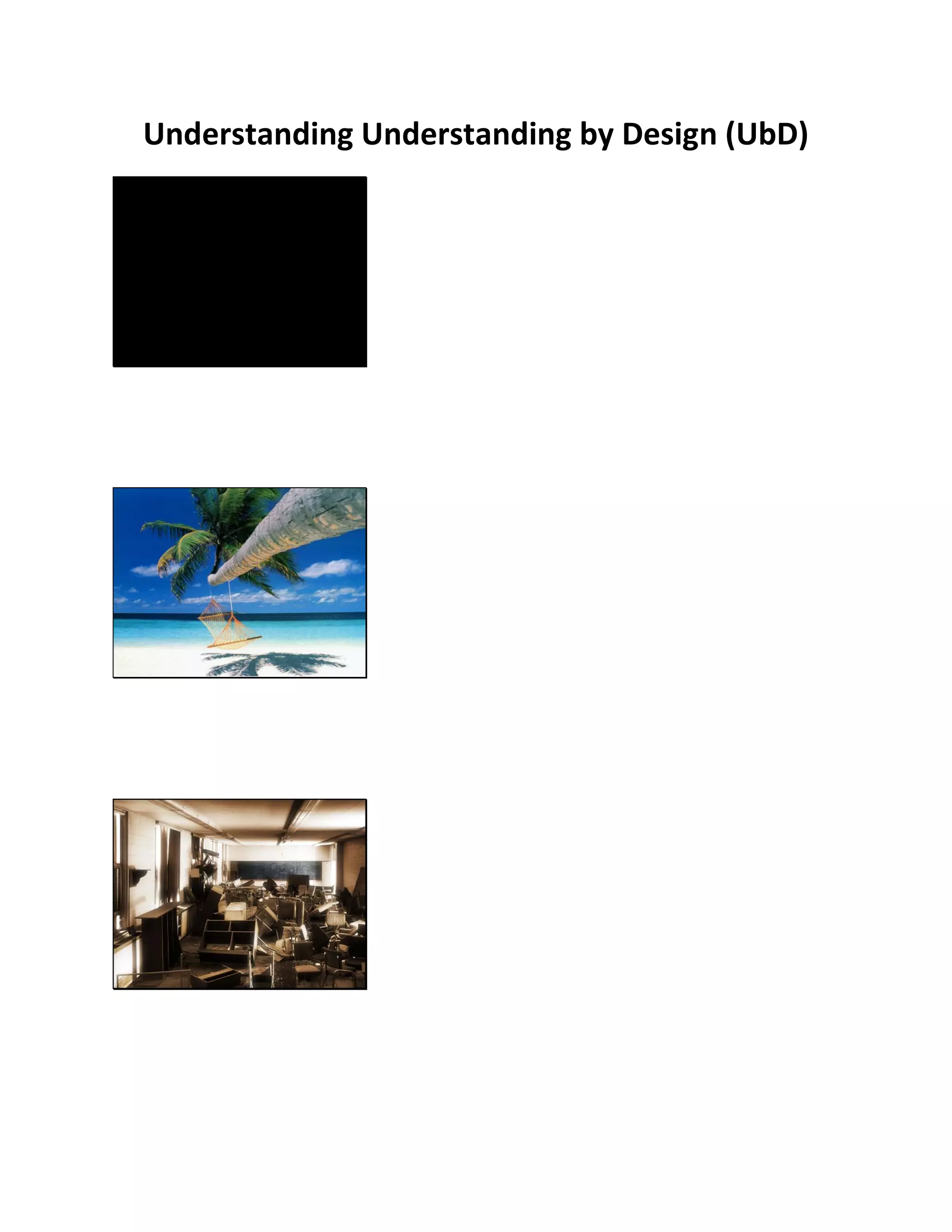 The document discusses the concept of Understanding by Design (UbD), emphasizing the importance of focusing on the desired learning outcomes before planning lessons and activities. It critiques the common practice of starting with teaching methods and materials instead of clearly defined educational goals, arguing that effective curriculum development should be aligned with desired results. The text outlines a three-stage process for effective curriculum design: identifying desired results, determining acceptable evidence of understanding, and planning appropriate instructional experiences.