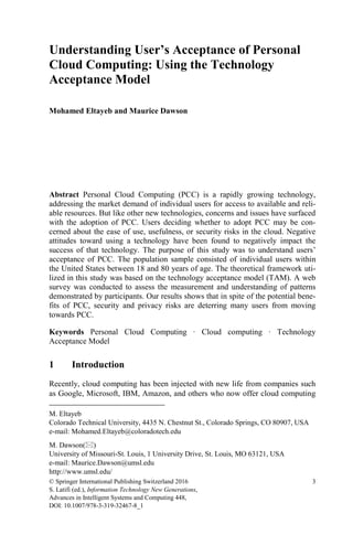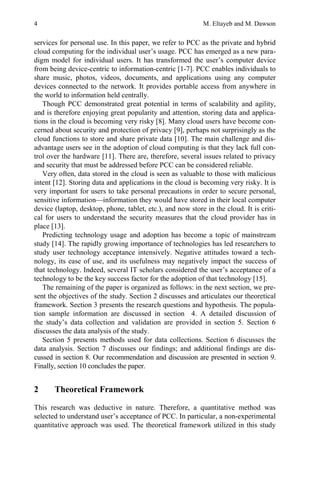 The study investigates user acceptance of personal cloud computing (PCC) utilizing the Technology Acceptance Model (TAM), focusing on perceived ease of use, perceived usefulness, and user attitudes. Results indicate that security and privacy concerns deter users despite PCC's benefits, with perceived usefulness having the most significant impact on acceptance. The research highlights the importance of understanding user attitudes and the implications for improving user adoption of PCC technologies.