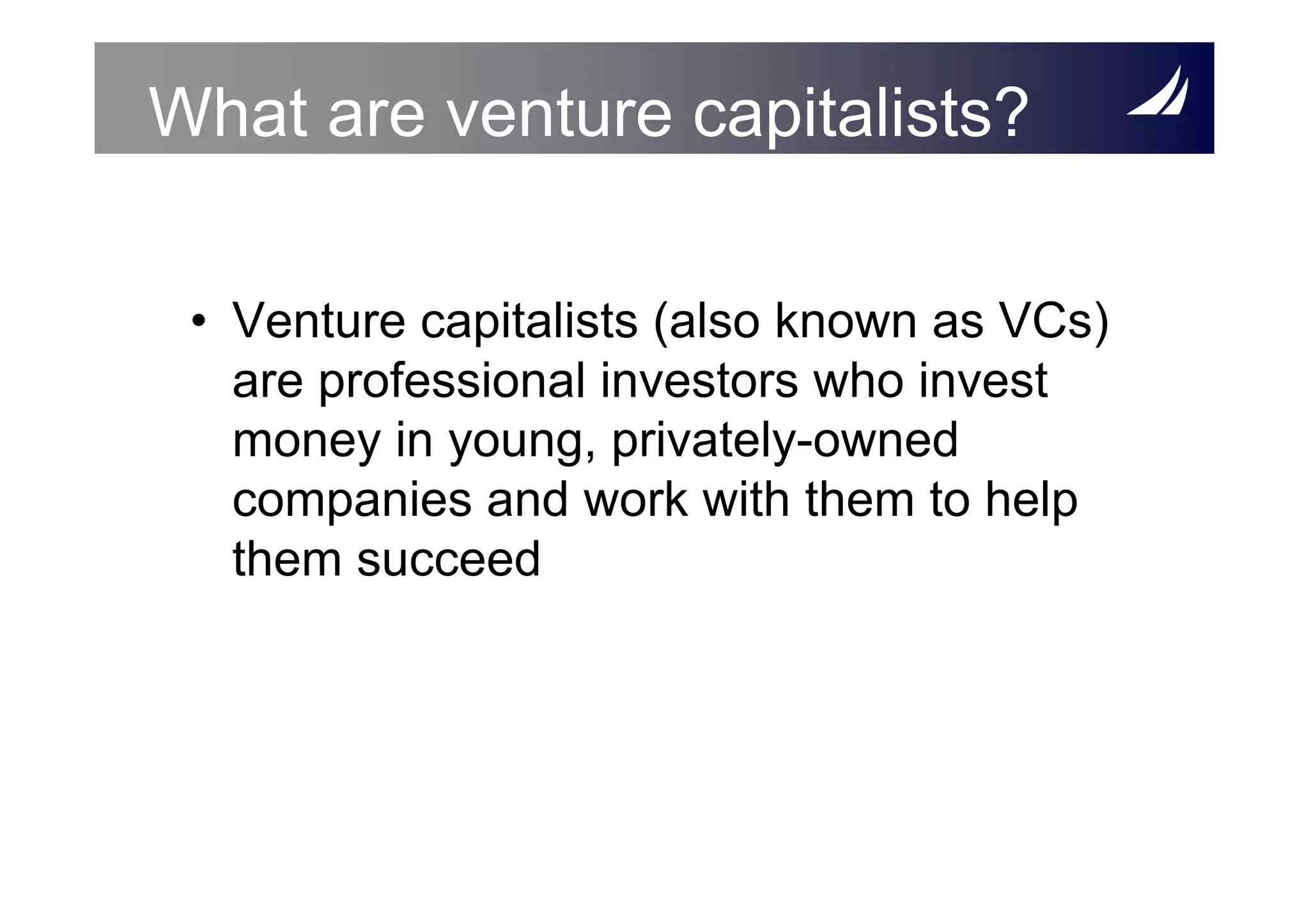 Venture capitalists (VCs) are professional investors who provide equity financing to young, privately-owned companies, primarily in the technology sector, with the goal of achieving substantial returns on investment. Upon receiving and analyzing investment proposals, VCs invest in a small percentage of companies, often requiring significant growth potential and a capable entrepreneurial team. Despite high risks, VCs aim for returns of at least 10 times their initial investment over a 4-5 year horizon, with portfolio strategies reflecting the expectation that many investments will fail.