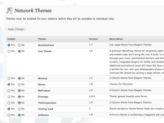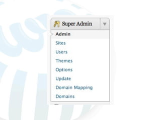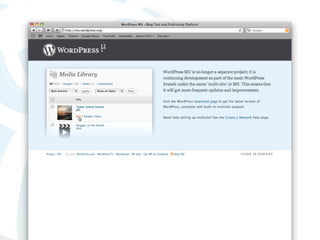 The document discusses WordPress multisite, outlining its capabilities such as managing multiple blogs under one installation and simplifying upgrades. It highlights the historical development, terminology changes, and resources available for managing multisite environments. Key considerations include security and resource usage, along with useful links for further information.