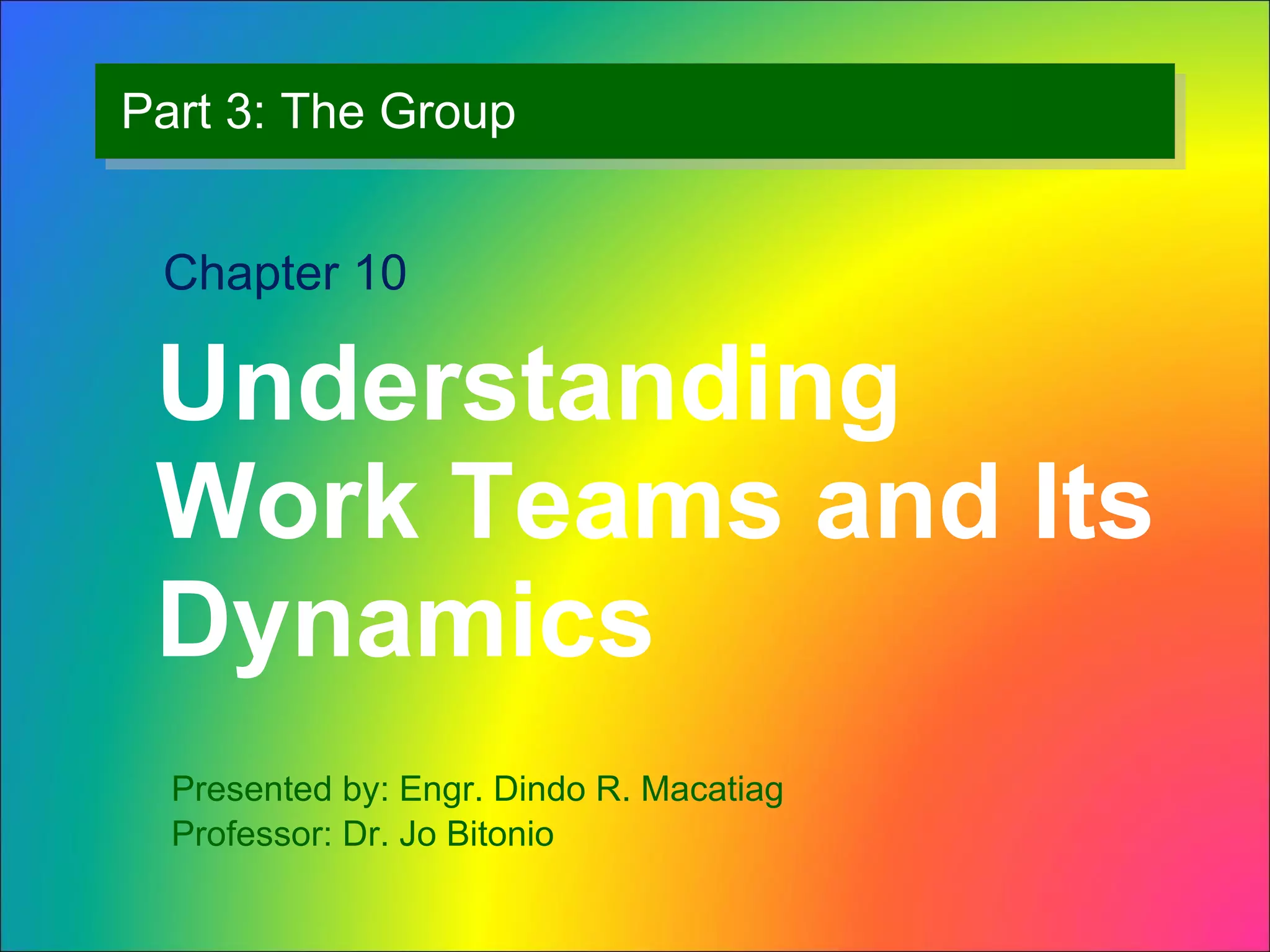 Teams are becoming more popular in organizations as they allow employees to use their talents better and are more flexible than individuals. A work team is defined as a group whose efforts are greater than the sum of individual inputs. There are different types of teams such as problem-solving teams, self-managed teams, task forces, committees, cross-functional teams, and virtual teams. Creating effective teams requires factors such as adequate resources, leadership, trust among members, and proper performance evaluations. Team composition, work design, processes, and leadership are also important for team success. However, teams are not always preferable to individuals for certain types of work.