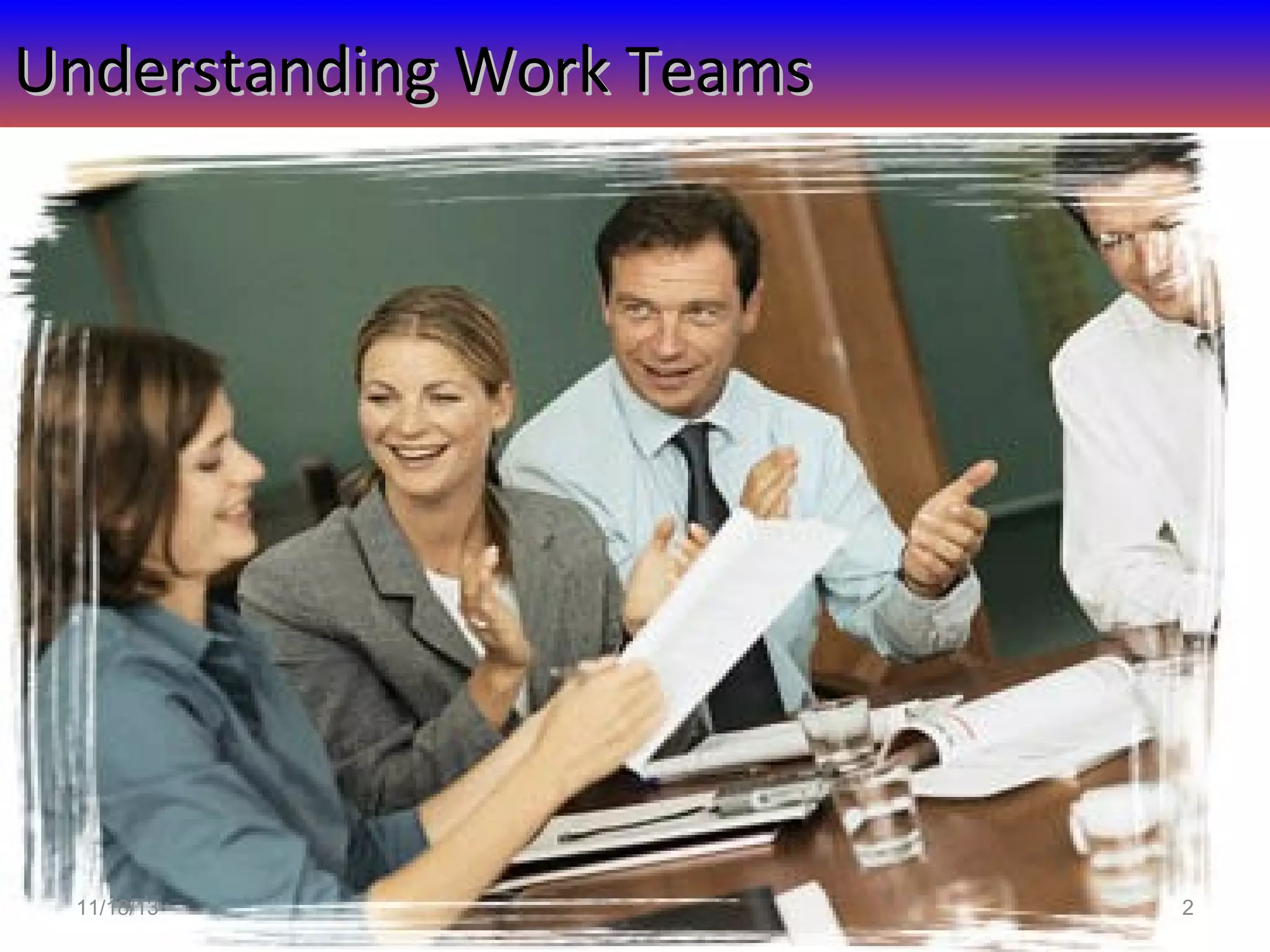 Teams have become popular because they can outperform individuals on complex tasks, better utilize employee talents, and increase employee motivation. There are two main types of teams - work groups that share information to help members perform individual tasks, and work teams that generate synergy through coordinated effort towards a common goal and achieve performance greater than the sum of individual inputs. The four main types of teams are problem-solving teams that share ideas to improve work processes, self-managed teams of 10-15 employees that take on supervisory responsibilities in addition to tasks, cross-functional teams with diverse members from different areas that develop new ideas, and virtual teams tied together through technology to achieve goals despite physical distance.
