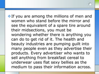The document discusses the significance of belly fat, emphasizing that it has both aesthetic and health implications. It distinguishes between subcutaneous fat, which is visible and less harmful, and visceral fat, which poses serious health risks by affecting internal organs and increasing the likelihood of chronic diseases. Overall, understanding and addressing belly fat is crucial for maintaining good health and preventing various health issues.