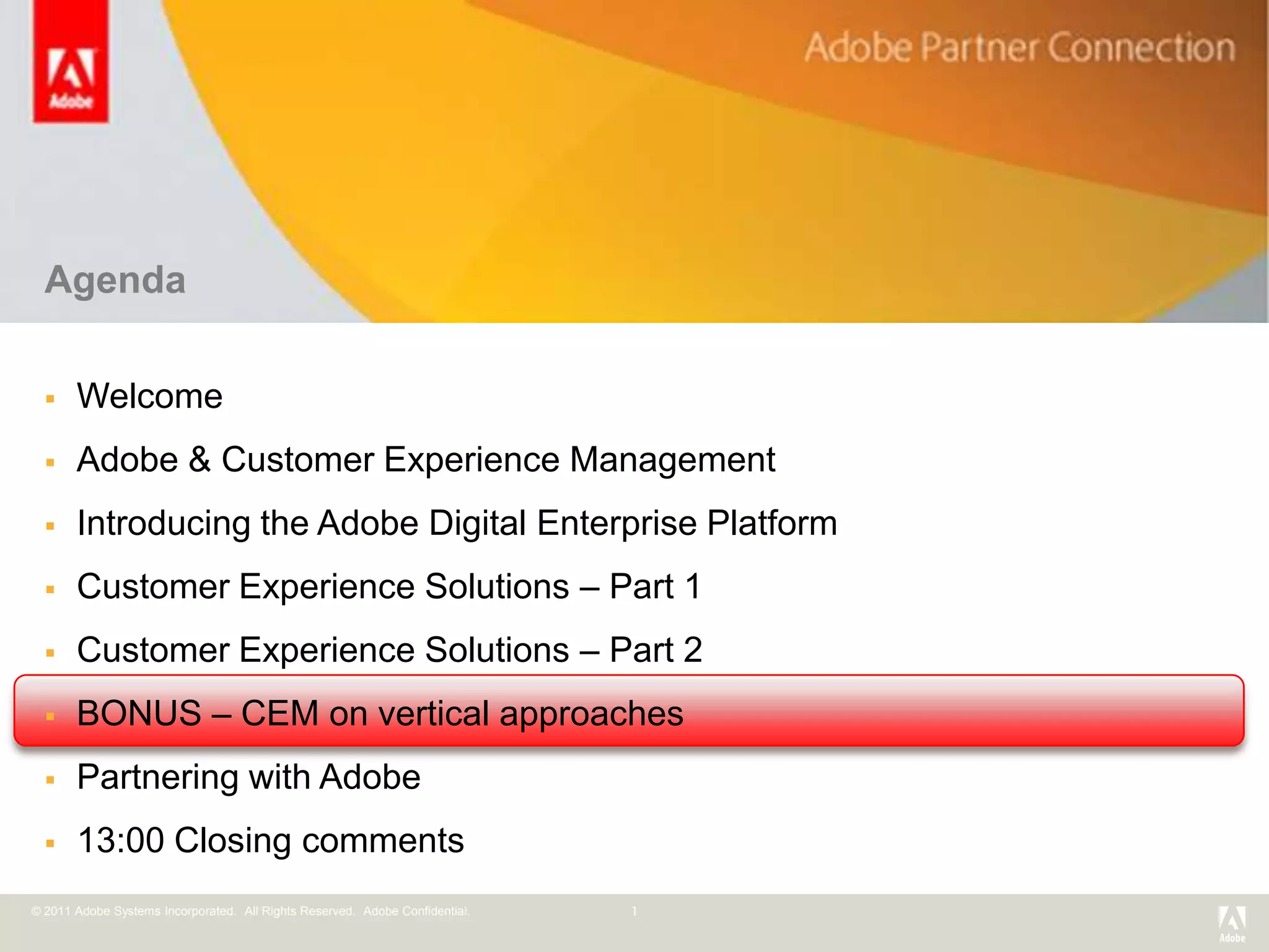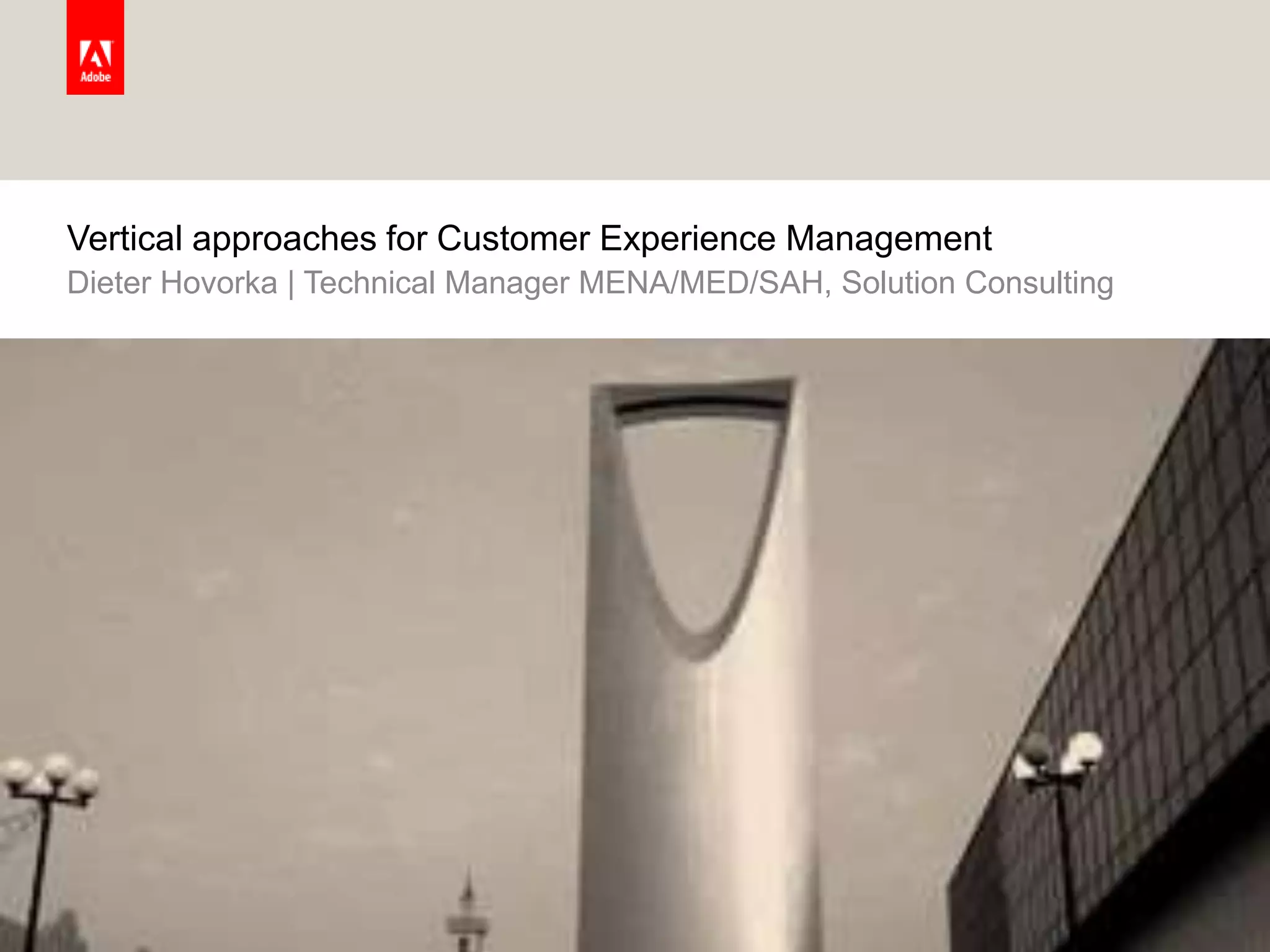 The document outlines Adobe's customer experience management strategies, including an introduction to their digital enterprise platform and various solutions for customer acquisition and retention. It highlights success stories and improvements in efficiency and revenue for various industries, emphasizing the importance of digital services and mobile strategies. Additionally, it provides a call to action for organizations to enhance customer-centric processes using Adobe's tools and consulting services.