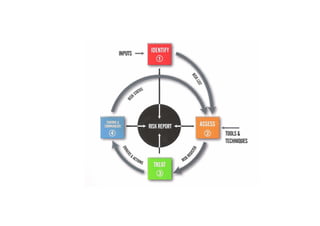 The document discusses understanding and managing risk within complex supply chain projects. It outlines different types of risks that can occur, such as financial, operational, strategic and political risks. It also discusses identifying and evaluating risks through methods like risk mapping, workshops and prioritizing risks based on probability and impact. Finally, it discusses implementing risk processes and governance through tools like risk registers, probability impact grids, stage-gate processes, and defining roles for risk management.