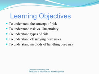 The document outlines the concept of risk, distinguishing between risk and uncertainty, and defines various types of risks, including personal, property, and liability risks. It discusses methods for managing pure risk, such as avoidance, loss control, retention, and transfer through contractual agreements. Additionally, it categorizes hazards impacting loss severity and provides insight into pure and speculative risks.