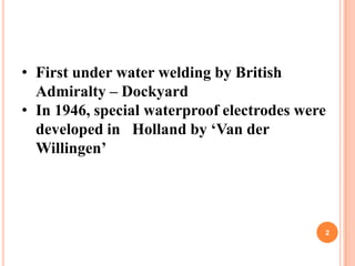 The document discusses underwater welding technology. It describes how underwater welding was first developed by the British Admiralty and then special waterproof electrodes were created. It discusses the different types of underwater welding including wet welding, dry welding using hyperbaric chambers, and different habitat sizes. It outlines the challenges of underwater welding including costs and equipment needs. It also discusses the welding processes, necessary equipment, safety considerations, and developing automation trends in the field.