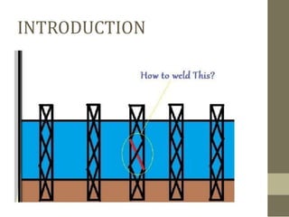The document discusses underwater welding, detailing its history, methods (wet and dry), advantages, and challenges encountered during operations. It highlights the significance of underwater welding in repairing offshore structures and the need for advanced techniques to improve weld quality, particularly in deep water. Recent developments include automation in welding processes and alternative techniques such as friction and explosive welding.