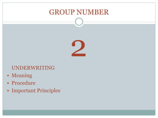 The document discusses the process of insurance underwriting. Underwriting involves evaluating risks to determine whether to issue an insurance policy to an applicant. It aims to select applicants that will likely have claims below assumed losses to ensure a profit. The underwriter considers the applicant's exposure, pricing alternatives like modifying coverage, and monitors policies to maintain satisfactory results for the insurance company. Underwriting balances risks across policyholders and ensures adequate premiums are charged for expected losses.
