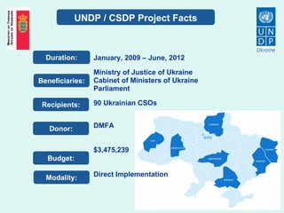 The document summarizes the Civil Society Development Programme, a joint initiative between UNDP and the Danish Ministry of Foreign Affairs to strengthen civil society in Ukraine from 2009-2012. The program aimed to simplify CSO registration, reduce government regulation of CSOs, improve financial sustainability for CSOs, and promote transparent and accountable government policies through building the capacity of 90 Ukrainian CSOs and improving the legal environment for civil society. Key results included facilitating legal framework improvements, strengthening over 60 CSOs, and providing grants to CSOs that expanded services for vulnerable groups and enhanced citizen participation and human rights.
