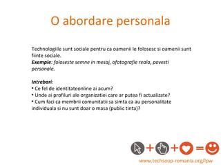 Documentul oferă un ghid pentru utilizarea uneltelor și strategiilor de comunicare eficiente în contextul social media, subliniind importanța ascultării activă a comunității. Se discută despre diverse platforme și tehnici, cum ar fi blogurile, e-mailul și povestirile video, pentru a întări relațiile cu membrii comunității. De asemenea, se subliniază disponibilitatea resurselor și comunităților online care sprijină implementarea tehnologiilor sociale în campanii.
