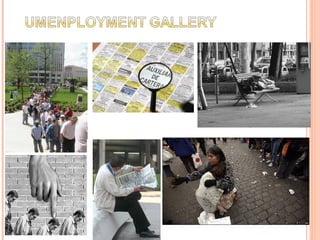 The document discusses the issues of unemployment and poverty. It states that unemployment leads to many problems in both rural and urban areas around the world, as both children and adults face consequences like theft, violence, risky jobs, difficult lives, and lack of opportunities. When the economy is unable to provide jobs, it can result in poverty, low quality of life, and social issues like violence. The document advocates for support of education and decent work opportunities to address unemployment and its effects on individuals and society.