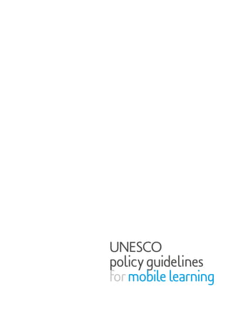The document outlines UNESCO's policy guidelines for mobile learning. It begins by defining mobile learning as involving the use of mobile technology, either alone or in combination with other ICT, to enable learning anytime and anywhere. It then discusses some of the unique benefits of mobile learning, including expanding access to education, facilitating personalized learning, providing immediate feedback and assessment, enabling anytime/anywhere learning, and improving communication and administration. The document concludes by providing 10 policy guidelines for mobile learning that focus on areas such as developing policies, training teachers, creating educational content, ensuring gender equality, expanding connectivity, and promoting safe and responsible use of mobile technologies.