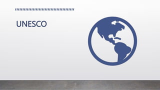 UNESCO is a specialized agency of the United Nations that seeks to build peace through international cooperation in education, science, and culture. Its objectives include attaining quality education for all, mobilizing science for sustainable development, fostering cultural diversity, and building inclusive knowledge societies. UNESCO focuses on areas like education, which transforms lives; protecting cultural and natural heritage; using science for sustainability; social and human sciences; and communication and information to promote freedom of expression.