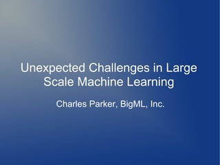 The document presents insights from Charles Parker of BigML on the challenges and research directions in large-scale machine learning. It covers issues like data processing speed, assumptions in data distribution, and new complexities introduced by big data, particularly 'slow arrival' scenarios where data does not arrive all at once. The discussion emphasizes the importance of adapting algorithms and methodologies to effectively handle varying data conditions and invites feedback on these preliminary observations.