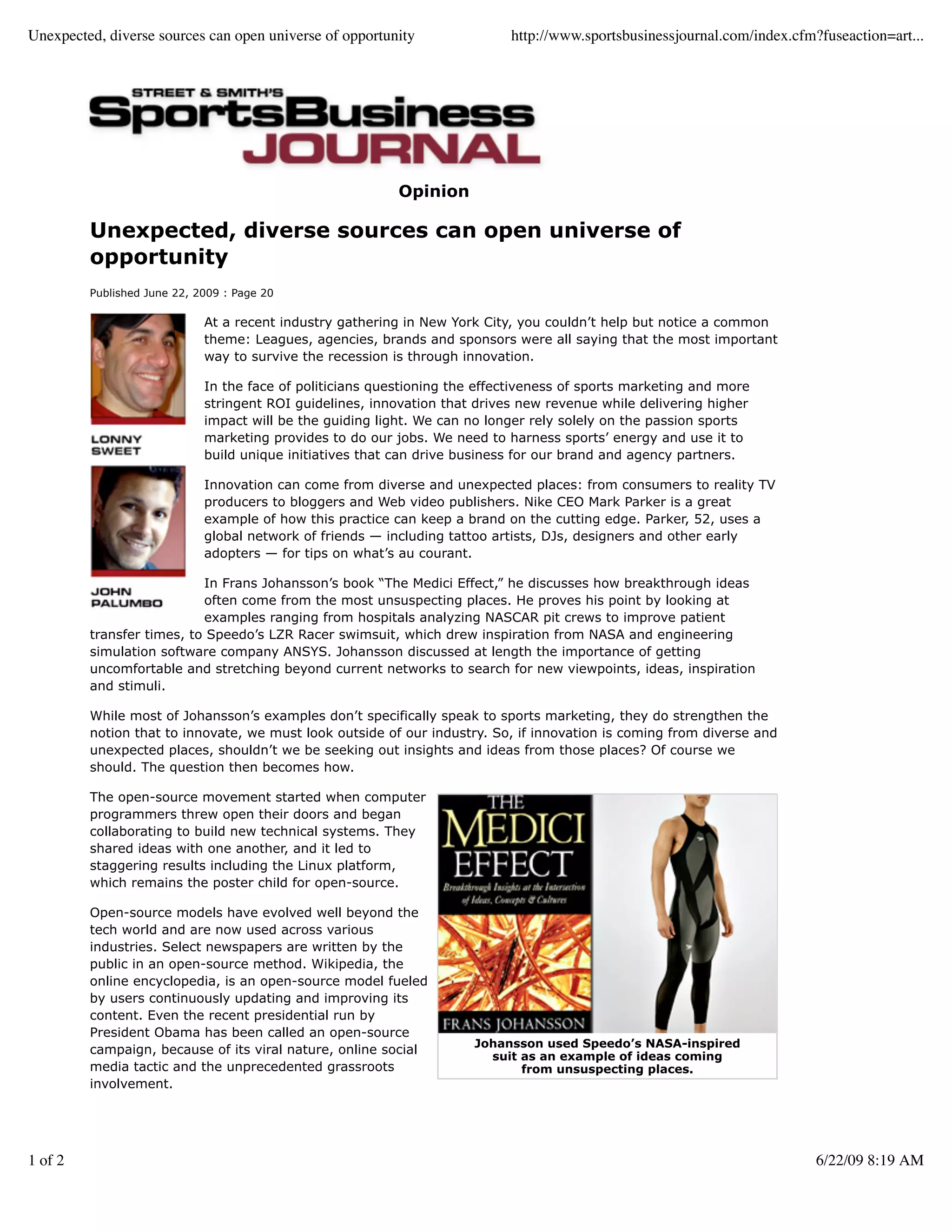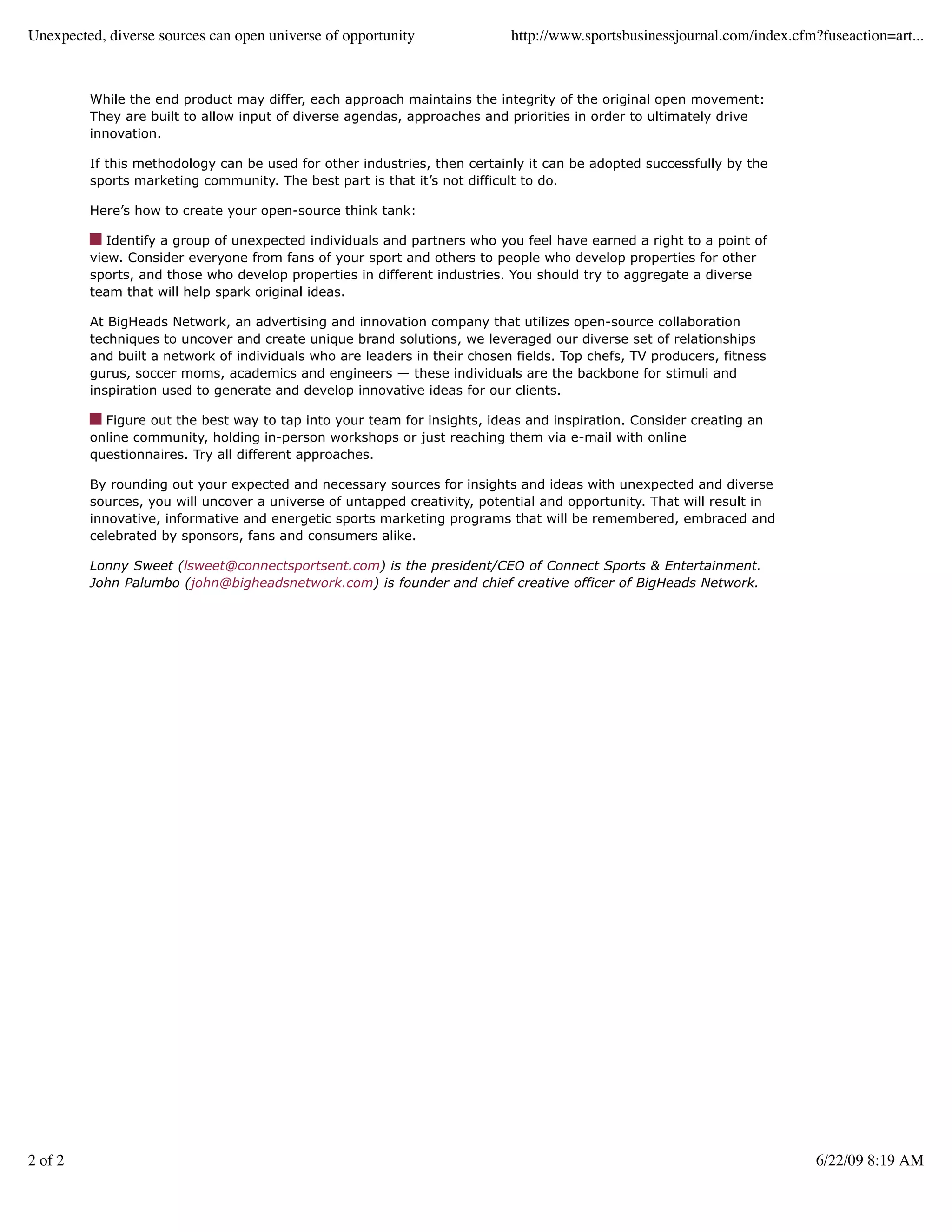 The document discusses how innovation in sports marketing can come from unexpected and diverse sources outside the industry. It advocates creating an "open-source think tank" by identifying a diverse group of individuals from various backgrounds to generate new ideas. This includes fans, people in other sports/industries, top chefs and more. Gathering insights from such a wide range of people can uncover creative solutions and opportunities for innovative programs that engage sponsors and fans.