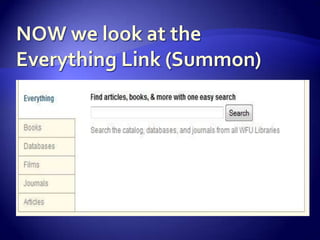 The document details a presentation on library search techniques by Kevin Gilbertson, Lauren Pressley, and Joy Gambill, highlighting successes and challenges faced by students in accessing eBooks and other resources. It notes that while students were generally able to find their books, some struggled with searches for classic authors and specific titles. The presentation emphasizes the importance of using effective search strategies and understanding search result mechanisms.