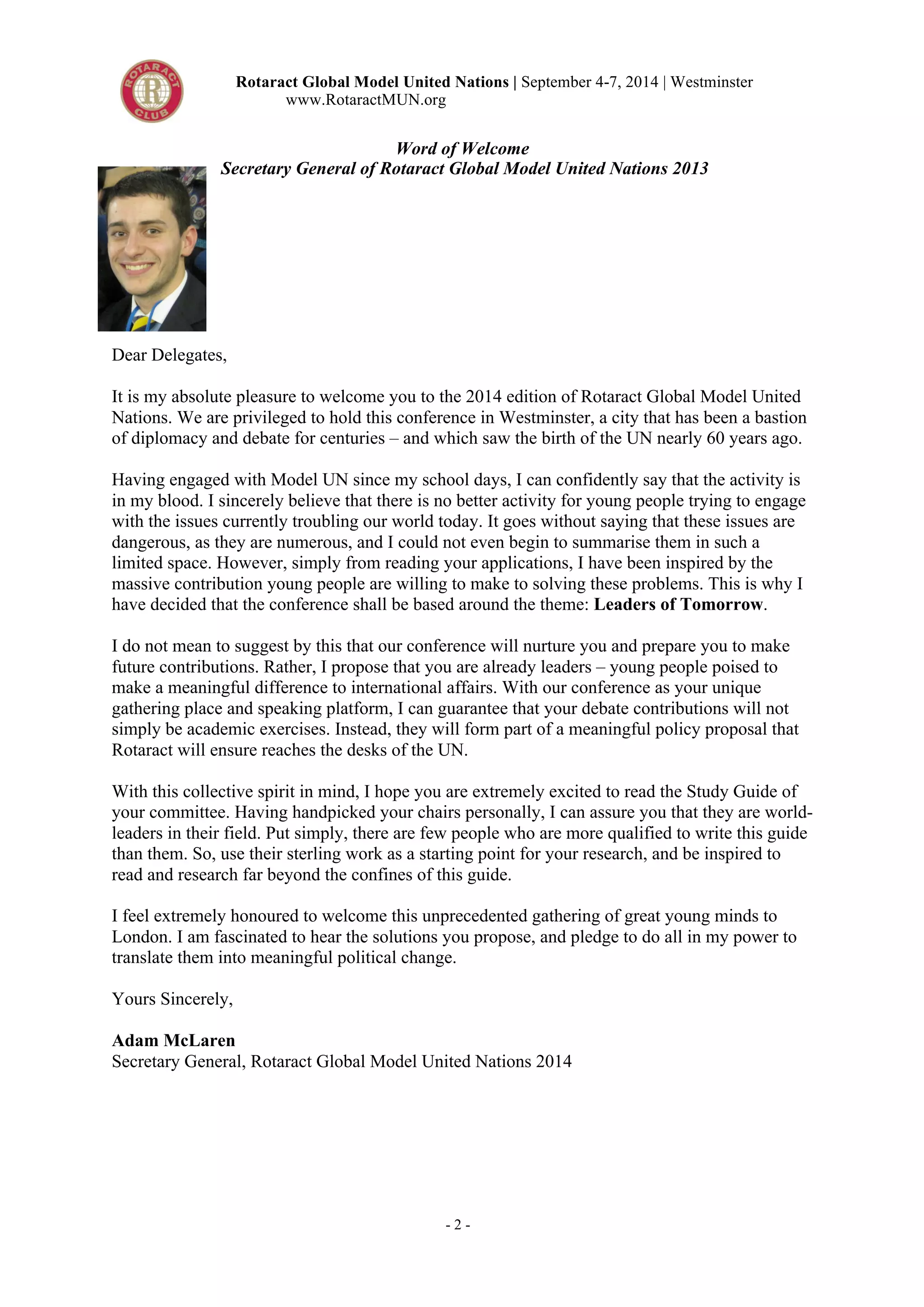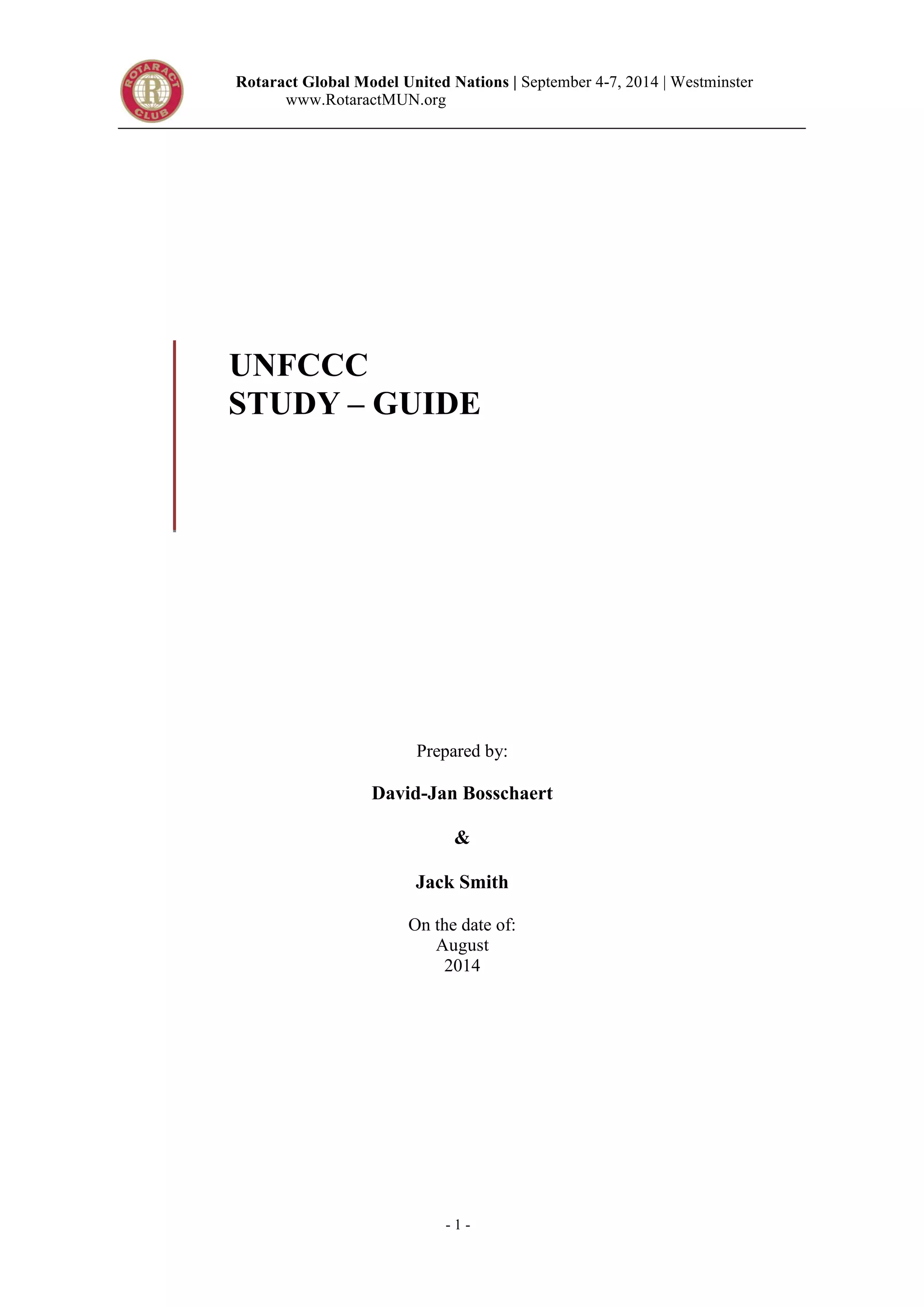 The document is a study guide for the UNFCCC committee at the 2014 Rotaract Global Model United Nations conference. It provides background information on climate finance and the Global Environment Facility (GEF), which manages climate funding for developing countries. Specifically, it outlines the GEF's six conditions for funding projects, including that they must be in an eligible developing country and address one of GEF's broad focal areas. It suggests some of these criteria could be removed to increase access to climate financing. The Secretary General's introduction welcomes delegates and emphasizes they are already leaders poised to make meaningful contributions on international issues.