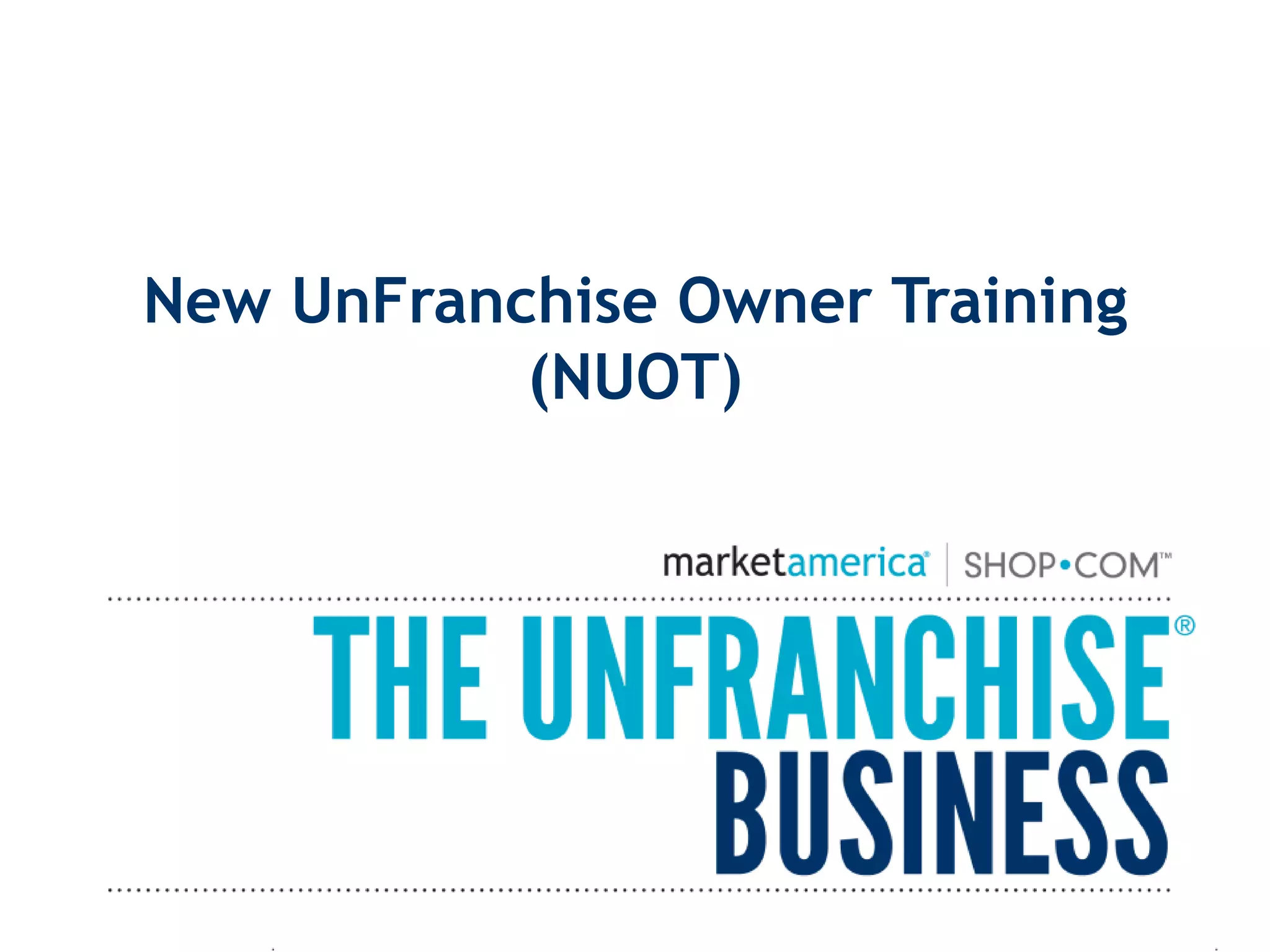 The document provides information about the trainings and requirements for different levels in the UnFranchise business model. It outlines three required trainings: New UnFranchise Owner Training, Executive Coordinator Certification Training, and Basic Five. It then describes the qualifications needed to become an Executive Coordinator, Master Coordinator, and higher levels, which involves meeting certain sales volumes and earning commissions. The document also defines key terms and introduces tools available to UnFranchise Owners like the UnFranchise Management System.