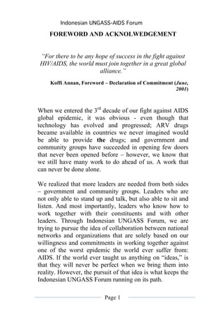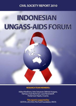 The document summarizes the objectives, methodology, and results of an assessment conducted by the Indonesian UNGASS AIDS Forum to understand issues related to human rights, gender, youth, and leadership in Indonesia's national response to HIV/AIDS. The assessment was conducted through focus groups, interviews, and secondary data collection across six cities. Key findings will be highlighted in the results section to analyze human rights implementation, issues faced by vulnerable groups, experiences accessing services, and leadership challenges in the national HIV/AIDS strategy. The Forum aims to contribute these qualitative findings to Indonesia's UNGASS 2010 reporting on the national epidemic.