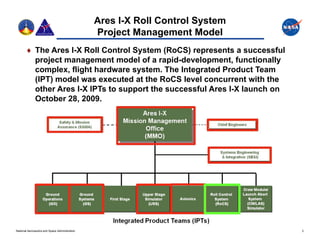 The document summarizes the development of the Ares I-X Roll Control System (RoCS) for the Ares I-X launch vehicle. The RoCS provided rotational control using a bi-propellant system developed under an Integrated Product Team model. Key aspects included delivering the system on schedule, within budget, and with high quality to support the October 2009 launch. Off-the-shelf and surplus government components were used, including components from decommissioned Peacekeeper missiles, saving over $10 million.