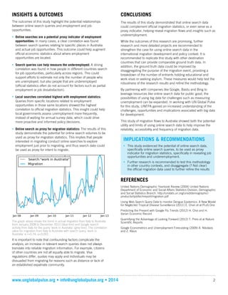 This document discusses a study conducted in partnership with the United Nations Population Fund (UNFPA) exploring the use of online search data to estimate migration flows, specifically analyzing search queries related to employment in Australia from 2008 to 2013. The findings suggest that certain online search queries could serve as proxy indicators for migration statistics, revealing insights about job opportunities and underemployment. Recommendations include further research in different contexts and collaboration with tech companies to enhance the utility of big data for migration analysis.