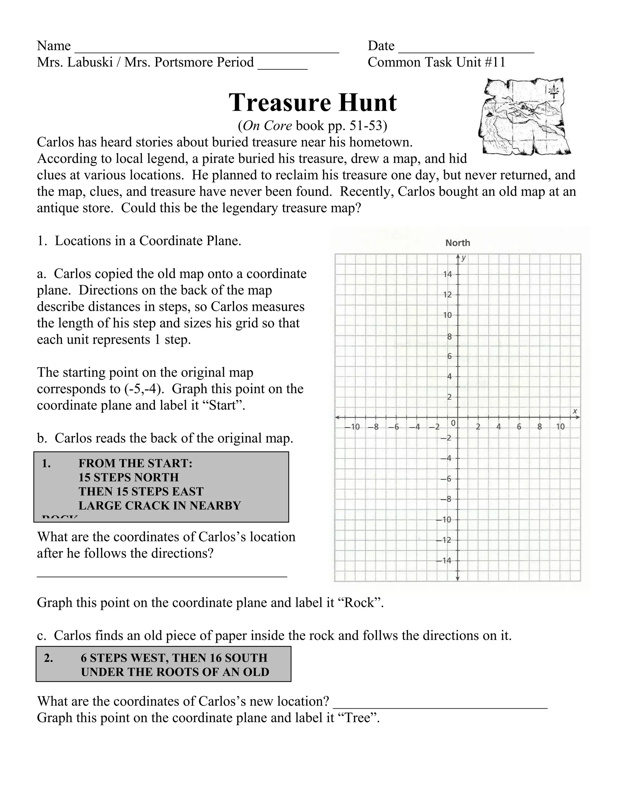 Carlos finds an old map and uses clues on it to follow a trail through coordinate points to locations like a rock and tree, eventually arriving at an old church. Under tiles at the church he finds a chest with more clues, including scrambled words and a table to unscramble them. The clues lead Carlos to Castle Island where he uses a scope to spot a beach and finds a cave there called Captain's Cave, opening a final chest to discover the treasure.