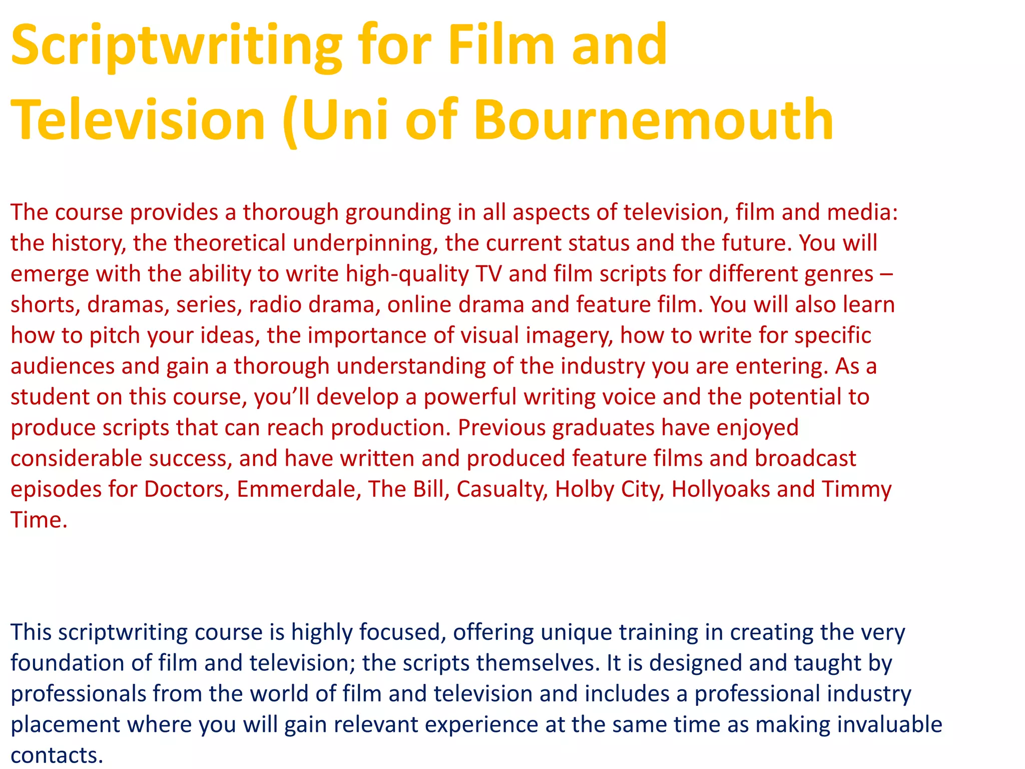 This course provides a thorough grounding in scriptwriting for film, television, and other media. Students will learn to write scripts for various genres and gain experience pitching ideas and understanding audience and industry. Previous graduates have seen success writing for popular TV shows. The course is taught by industry professionals and includes a placement for experience and contacts. It requires minimum grades of A*-C in GCSE maths and English.