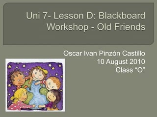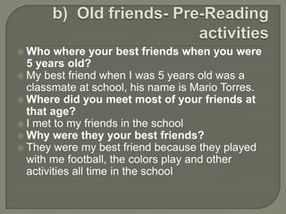 The document discusses a lesson about old friends from childhood. It asks students to recall their best friends from age 5 and what they used to do together in school. Some common activities included playing football and watching TV shows. The reading activity is about a website called classmates.com that helps people find old school friends and reconnect. It discusses how the site has tripled its membership recently as people search for old friends from work or their personal lives.
