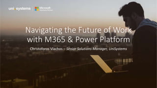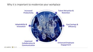 This document discusses how organizations can modernize their workplaces using Microsoft 365 and the Power Platform. It provides examples of how these tools can be used to improve collaboration, enhance productivity, and increase efficiency. Specifically, it outlines three use cases: expenses management using Power Apps, AI Builder, Power Automate, and Power BI; an IT service desk using Power Apps, Power Automate, Teams, and Power Virtual Agents; and contractor onboarding through SharePoint, Power Automate, and Teams. The document emphasizes that the Power Platform allows non-technical users to build customized solutions through low-code tools to streamline processes and business operations.