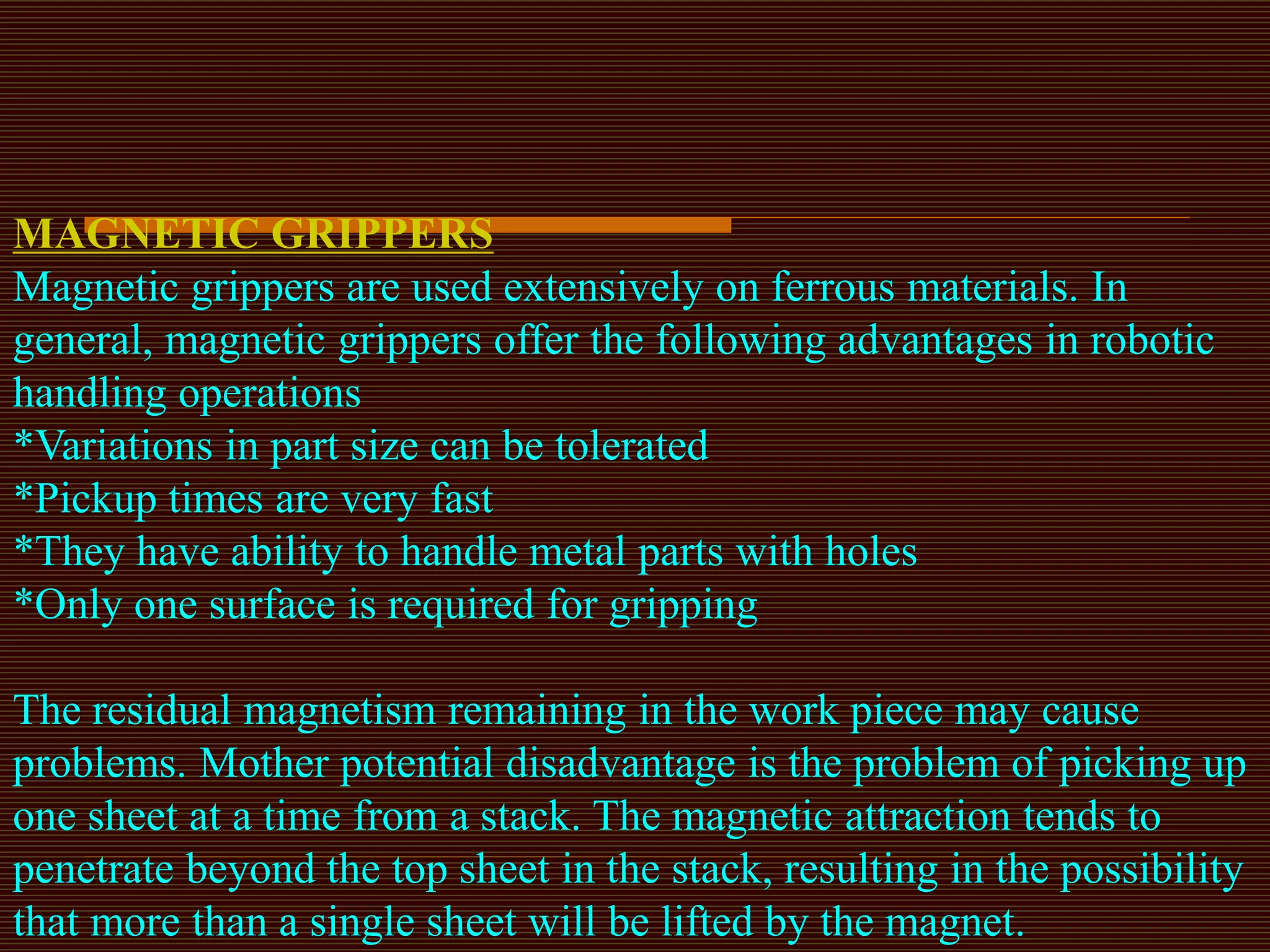 Magnetic grippers are used to handle ferrous metal parts and offer advantages like tolerating variations in part size, fast pickup times, and the ability to handle parts with holes using only one surface. However, residual magnetism and picking up multiple sheets from a stack can be disadvantages. Electromagnets are easier to control but require power, while permanent magnets do not require power but require a means to release parts. Adhesive and vacuum grippers can also be used but have limitations like losing tackiness and difficulty controlling amount scooped, respectively. Other grippers include hooks, scoops, and inflatable devices for fragile objects.
