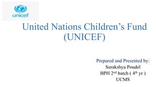 UNICEF was established in 1946 to provide emergency relief to children following World War II. It has since expanded its mission to promote children's rights and support their health, education, and protection worldwide. UNICEF has over 190 country offices and works in partnership with governments, NGOs, and other UN agencies. In Nepal, UNICEF has worked since the 1960s on issues like immunization, education, nutrition, and child protection. It currently focuses on health, WASH, social protection, and emergency response, and runs campaigns like GOBI-FFF to promote low-cost, high-impact interventions for children.