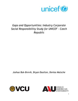 The document summarizes research conducted on corporate social responsibility (CSR) policies within the retail clothing industry in the Czech Republic. Interviews were conducted with two current UNICEF partners, Amway and Marks & Spencer. Both companies dedicate a portion of their budgets to CSR but feel UNICEF campaigns have been less successful in the Czech market. Secondary research found an increase in charitable giving and CSR engagement in the Czech Republic. However, companies may fear pressure from partnering with a large NGO like UNICEF. Only three of seven researched clothing companies had clear CSR policies relating to children's rights. The research aims to provide recommendations to improve UNICEF's partnerships within the industry.