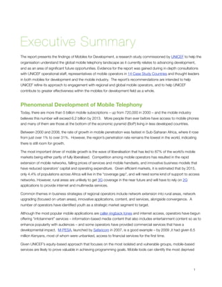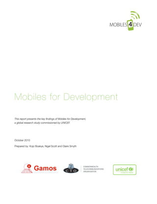 The UNICEF-commissioned report 'Mobiles for Development' highlights the rapid growth of mobile telephony, particularly in developing countries, and emphasizes the importance of mobile technology in advancing development goals. It presents findings from consultations with stakeholders and outlines recommendations for effective engagement with mobile operators to enhance service delivery in sectors like health and education. The study aims to refine UNICEF's approach to leverage mobile technology in addressing the needs of the most vulnerable populations.