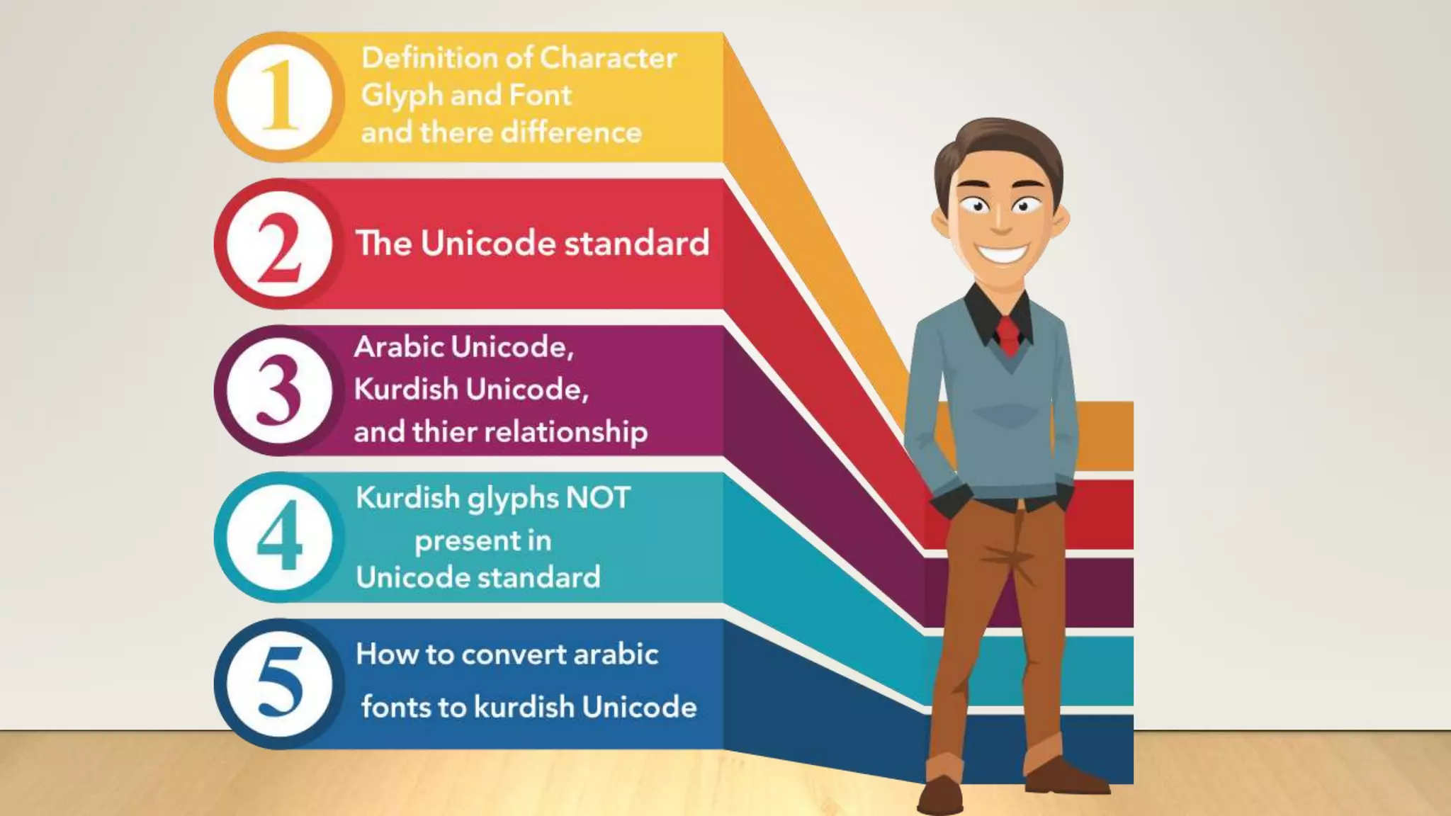 The document discusses the concepts of Unicode and Kurdish fonts, explaining the definitions of fonts, glyphs, and characters. It details the Unicode standard, including the encoding methods and character sets for various scripts, specifically highlighting Arabic and Kurdish Unicode. Additionally, it offers insights on how to change an Arabic keyboard to a Kurdish Unicode keyboard.
