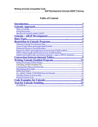Unicode is a standard for text representation that supports most of the world's writing systems. When writing ABAP code, developers must ensure string processing functions support Unicode to handle multilingual text correctly. This document provides guidance on writing Unicode compatible ABAP code to support globalization requirements.