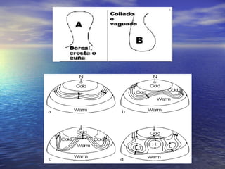 c) Frontes: - Superficies que separan masas de aire de características diferentes (temperatura), soen estar asociados a borrascas . 2 tipos: - Fronte cálida = se a masa de aire cálido ascende sobre a fría precipitacións suaves e persistentes e ascenso de temperaturas - Fronte fría = se a masa de aire cálido é obrigada a ascender violentamente pola fría precipitacións intensas e concentradas e descenso temperaturas. - Fronte ocluída : se os dous tipos de frontes se superpoñen = fin dos contrastes térmicos entre masas de aire ( “morte” da fronte)