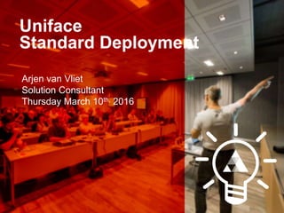 The document discusses the differences between classic and standard deployment methods for Uniface applications, outlining key aspects such as assignment settings, resource management, and compatibility issues. It provides detailed information on configurations necessary for both development and runtime environments, including the use of Uniface Resource Manager for deployment operations. Additionally, it highlights the advantages of standard deployment, such as ease of deployment and backward compatibility with classical styles.