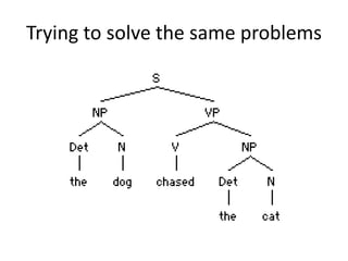 Unification grammar uses attribute-value matrices (AVMs) to represent syntactic and semantic information about words and phrases, without requiring movement operations. AVMs model words as structured objects with attributes like PHON, SYNSEM, CAT, and VALENCE/SUBCAT. Unification grammar combines syntactic objects when their attributes are compatible, such as when a verb's SUBJ attribute matches the CONT and CAT features of an appropriate subject noun phrase. This achieves composition through structure-sharing rather than movement. Head-driven phrase structure grammar (HPSG) is a popular type of unification grammar.