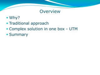 The document discusses internet security threats like malware, viruses, and spam. It describes how the traditional approach to these threats was to add standalone security technologies like antivirus, firewalls, and intrusion prevention systems. However, this led to complex solutions. The document then introduces unified threat management (UTM) as an integrated security appliance that consolidates these essential network security functions into a single device to provide an easier to manage solution to the new challenges posed by the internet.