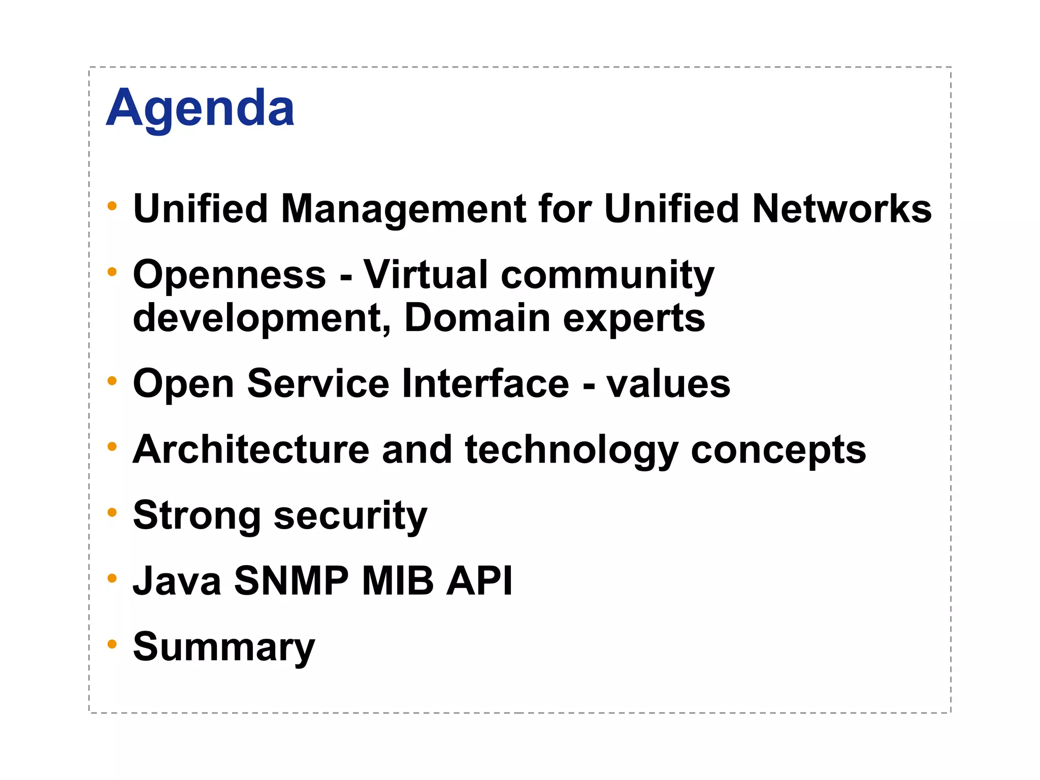 The document introduces a new open networking architecture that leverages Java-enabled network devices for unified management, enhancing security and enabling cross-platform development. It outlines the value propositions of an open service interface, emphasizing reduced development costs, improved scalability, and the potential for innovation through third-party contributions. Additionally, it discusses the Java SNMP MIB API, which simplifies client use and optimizes access while maintaining a strong security model.