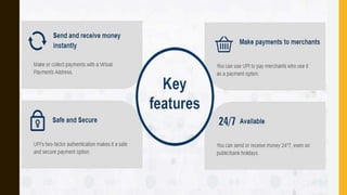 UPI is a common platform that allows users to instantly transfer money between bank accounts using only a virtual payment address. It was developed by the National Payments Corporation of India to facilitate fast, cashless transactions without needing account numbers or IFSC codes. UPI simplifies payments by mapping accounts to a single address and allowing users to send money with just a few clicks by entering the payee's virtual ID, amount, and confirmation.