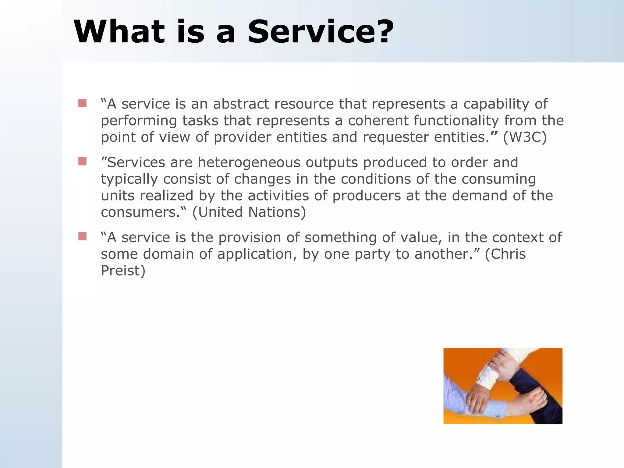 The document discusses different perspectives on defining and understanding services. It provides definitions of services from various sources that describe services as capabilities to perform tasks, outputs produced to order to fulfill consumer needs, and the provision of value from one party to another. It also discusses services in terms of abstraction, restricted access to resources through a service rather than ownership, and co-creation of value between provider and customer.