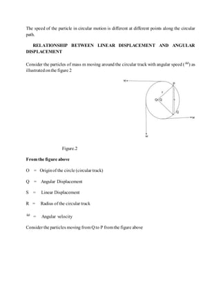 This document discusses uniform and non-uniform circular motion. It defines uniform circular motion as motion at constant speed along a circular path, requiring centripetal acceleration towards the center. Non-uniform circular motion has varying speed. Key terms are defined, including angular displacement, velocity, acceleration, time period, frequency, centripetal acceleration and force, and centrifugal force. Relationships between linear and angular quantities are derived. Common examples of centripetal force are given, like planetary orbits and electrons orbiting nuclei. Applications of circular motion include centrifuges and banking in roads.