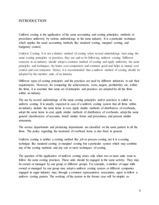 Uniform costing aims to standardize costing principles and methods across companies in the same industry. There are several difficulties in implementing a uniform costing system, as cost structures may vary between companies due to differences in size, technology used, product ranges, efficiency levels, and managerial planning. However, uniform costing also provides advantages like facilitating cost comparisons, eliminating unhealthy competition, improving efficiency, providing relevant cost data, and ensuring standardization. For a uniform costing system to be successful, companies must cooperate by sharing accounting information and adopting common costing classifications, distribution methods, and reporting formats.