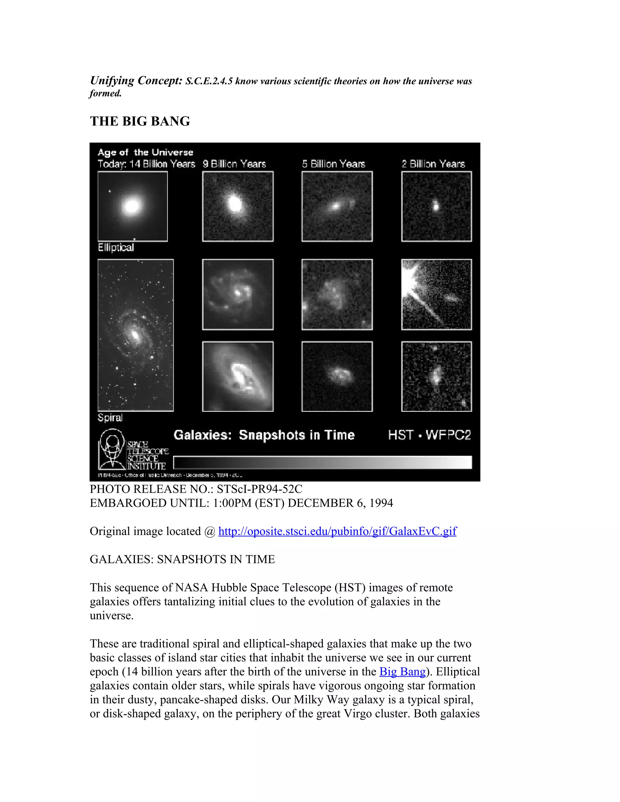 The document summarizes images from the Hubble Space Telescope that offer clues about the evolution of galaxies in the universe. The images show galaxies from different eras after the Big Bang. Earlier images show galaxies with less defined spiral arms and more irregular shapes, suggesting spirals took a long time to form while elliptical galaxies emerged earlier. Even in the earliest images, one galaxy has the light profile of an elliptical galaxy, implying ellipticals formed remarkably early in the universe.